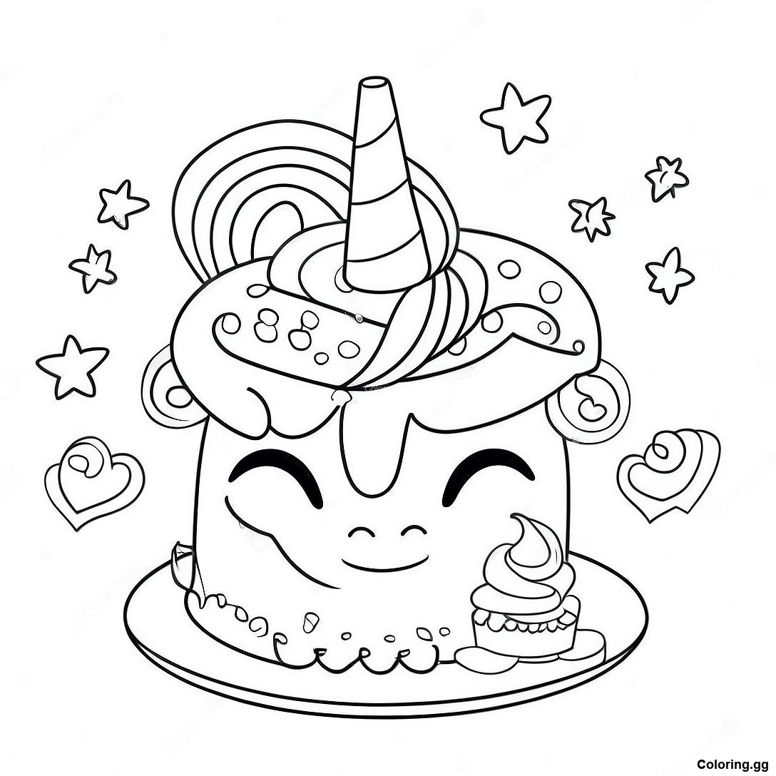 ਚਮਕਦਾਰ ਯੂਨੀਕੌਰਨ ਕੇਕ ਰੰਗ ਕਰਨ ਵਾਲਾ ਪੰਨਾ